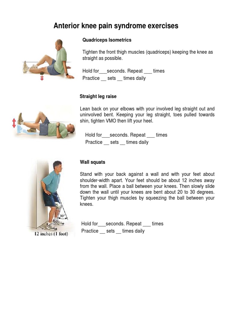 The typical treatment for this condition is a course of physiotherapy exercises although the symptoms will commonly resolve once growth has stopped 16 years old for girls. Anterior Knee Pain Exercises - Free download as PDF File pdf Text File txt or read online for free. Perform 2 sets of 30 seconds twice a day.